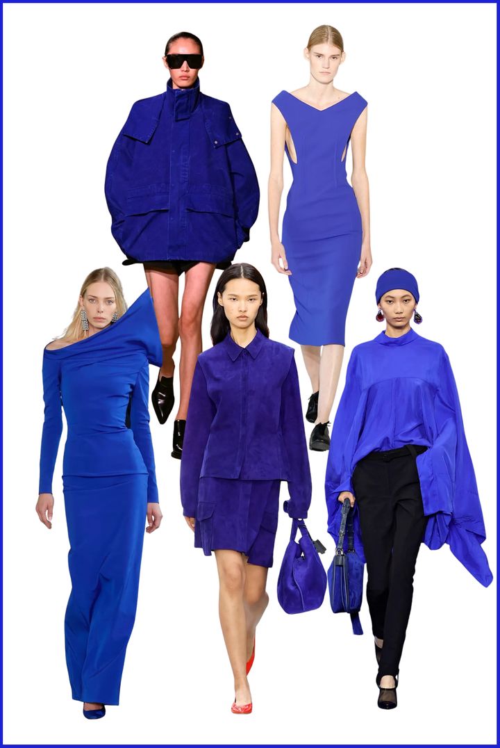 深みのあるディープブルーは、クールで知的さあふれる色として人気上昇。コバルトブルーよりも落ち着きがありながら、ネイビーよりも鮮やか。「アクリス」ではスエードのセットアップでディープブルーのクールさに温かみを添え、「エリア」ではアシンメトリーなドレスに取り入れてシャープで洗練されたムードを演出。「ジル サンダー」や「ランバン」では、構築的なフォルムやシンプルなシルエットにディープブルーをのせることで、モードな存在感を際立たせていた。
