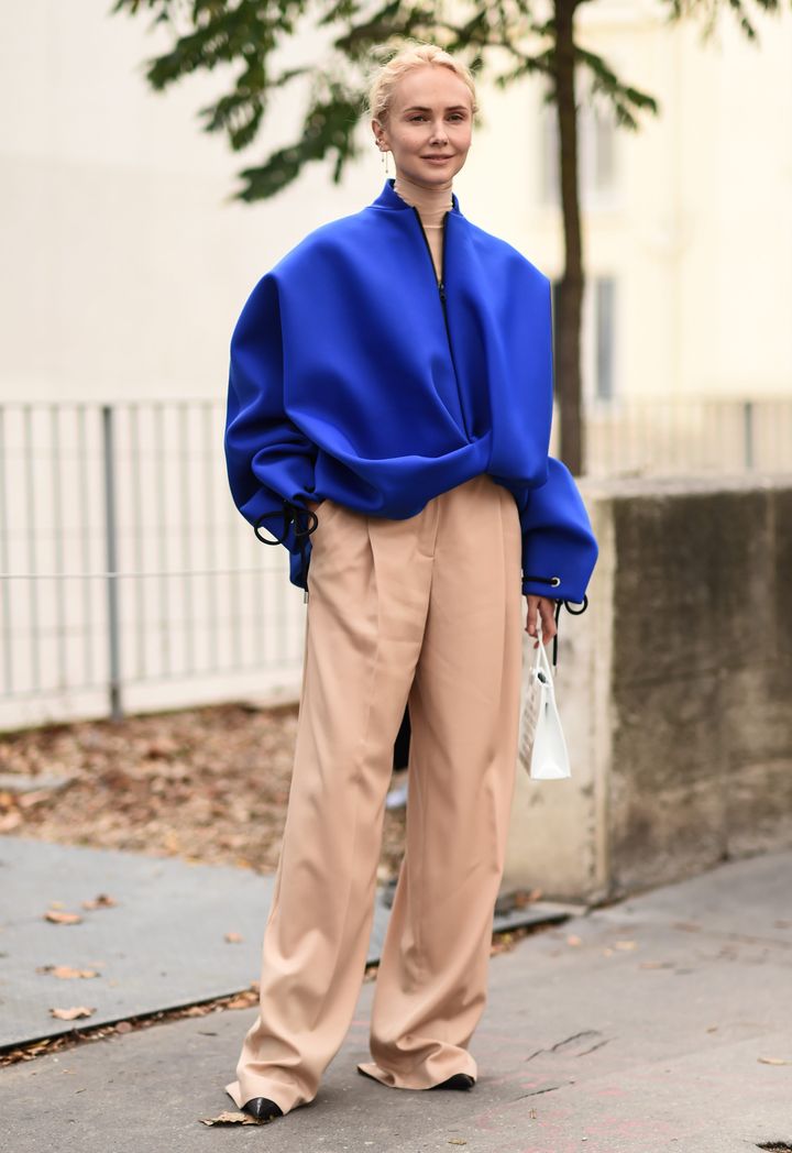 デイリーにディープブルーを取り入れるなら、ベージュやエクリュなどのニュートラルカラーを合わせて引き立てるのが正解。深みのあるブルーが際立ちながらも、全体のトーンはやわらかくまとまり、ほどよくモードで上品な印象に。