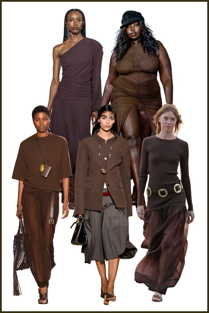 ここ数シーズン継続して注目されているモカブラウンが、今季もランウェイに多数登場。コーヒーのように深みがありながらも、まろやかで柔らかなトーンが特徴で、ナチュラルで洗練されたムードを演出してくれる。「シンシア ローリー」や「キム シュイ」では軽やかなシアー素材に落とし込むことで、ブラウンにありがちな重さを回避しつつセンシュアルに。同系トーンで全身を包むように取り入れることで、穏やかで洗練された空気感が生まれるのが今季らしいポイント。