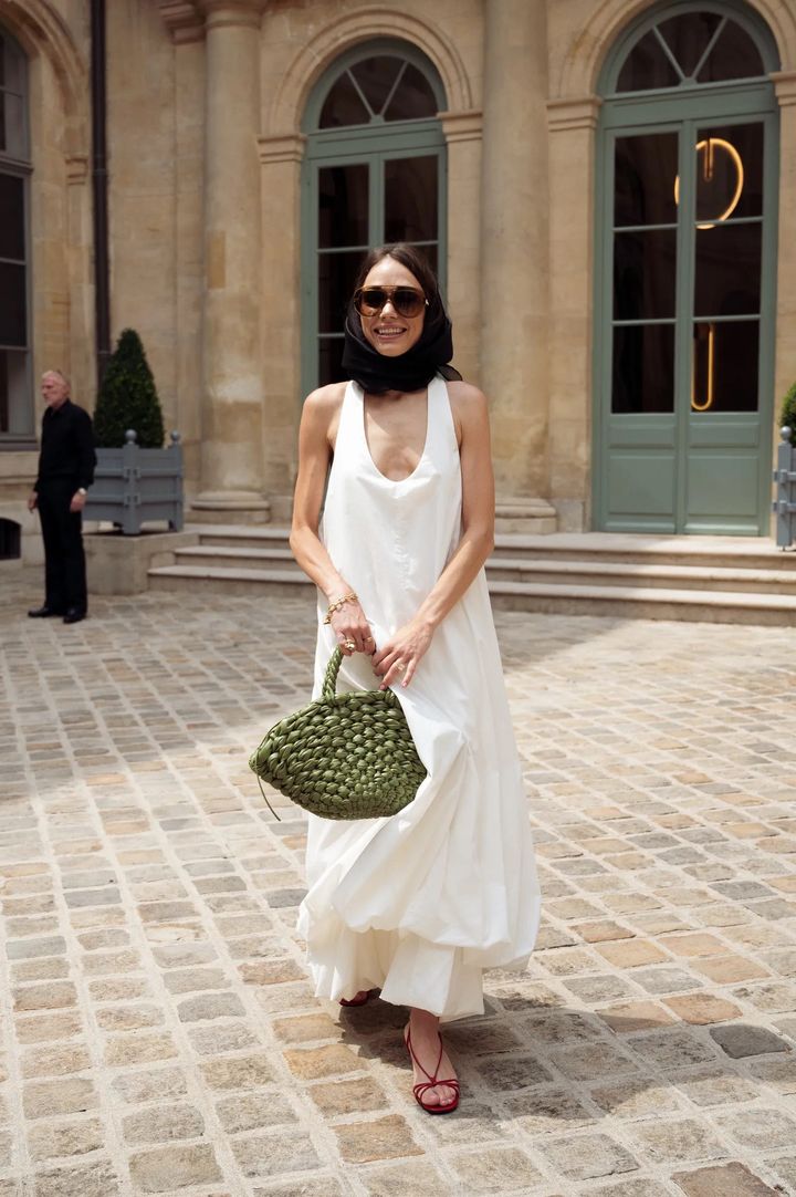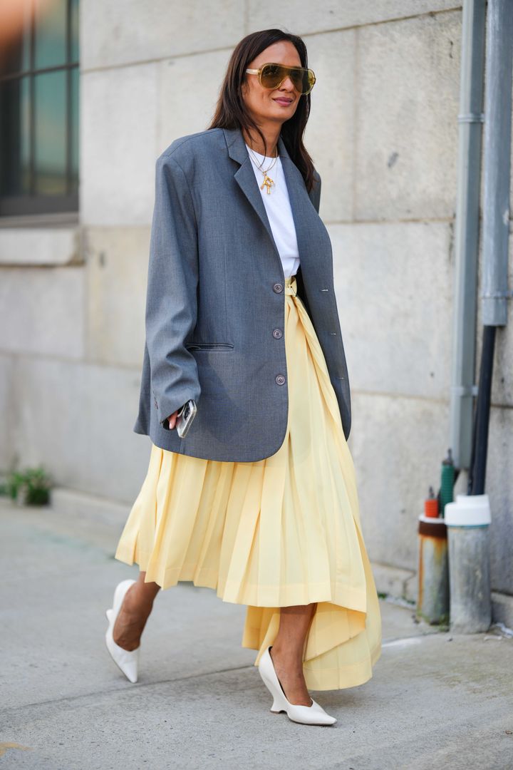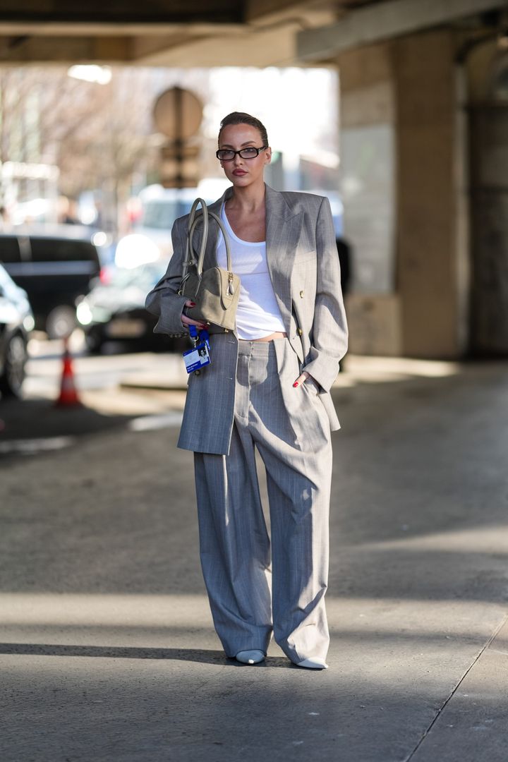 ライトグレーをベースに、白やチャコールなど同系色を重ねた“グレー・オン・グレー”が新鮮。また、メンズライクなジャケットやワイドパンツなどのテーラードアイテムを選び、インナーには白のタンクトップやシルクシャツを合わせると、抜け感のある今季らしいムードに。アクセサリーや小物はメタリックやレザーなど、質感に変化を持たせるのがポイント。