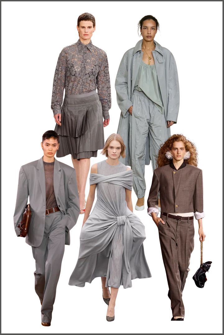 今季のランウェイで新たなベーシックカラーとして存在感を放ったのがグレー。ニュアンスの異なるトーンが多く登場し、ミニマルでありながら奥行きのあるスタイルを生み出していた。「ディオール」のジョナサン・アンダーソンのデビューコレクションでは、大きなリボンをあしらったグレードレスが話題に。さらに「シャネル」では、ツイードのセットアップにクロップド丈を取り入れ、クラシックと新しさが交差するバランスを提示。「アクネ ストゥディオズ」では、メンズライクなスーツをやや光沢のある素材で仕立て、端正さの中にモダンな軽やかさを添えた。主張しすぎないのに印象に残る、今季のキーカラーとしてランウェイを席巻した。