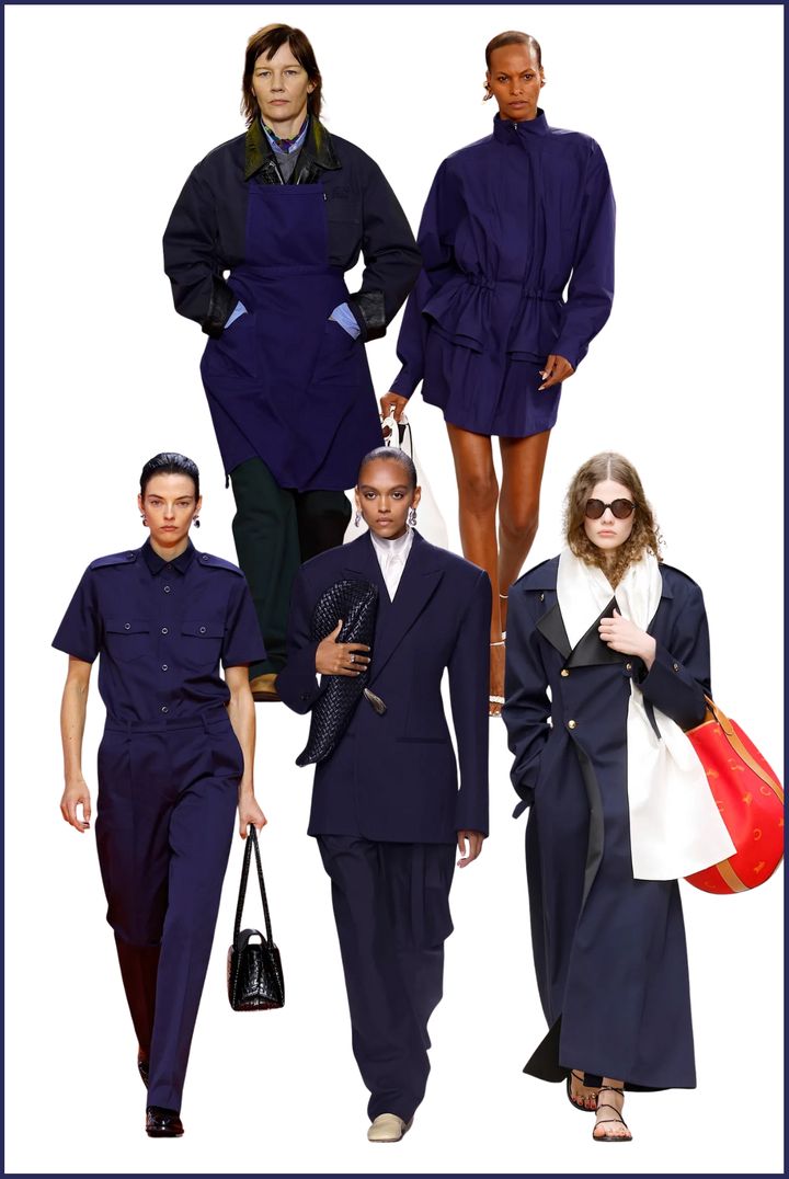 グレーと同じく、黒に変わるベーシックカラーとしてランウェイに躍り出たネイビー。「ボッテガ・ヴェネタ」では端正なテーラリングで品格を際立たせ、「フェンディ」ではユーティリティな要素を取り入れたドレスで都会的にアレンジ。「セリーヌ」ではトレンチコートを通して、ネイビーのタイムレスな魅力を引き出した。