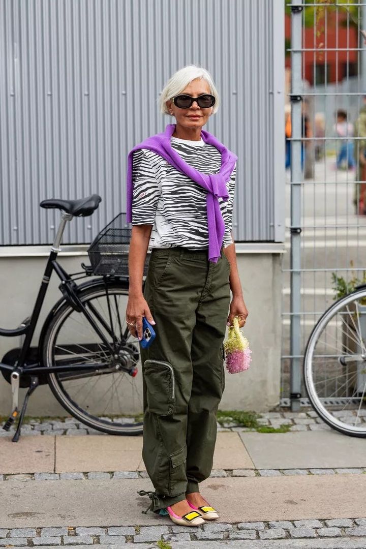 落ち着いたトーンでまとめがちなオリーブグリーンは、差し色を効かせてフレッシュに着こなすのがおすすめ。パープルやピンクなどのアクセントカラーを一点取り入れるだけでぐっとモードな印象に。落ち着きのあるオリーブがベースになることで、ビビッドカラーも浮かずにモードな印象に仕上がるのがポイント。
