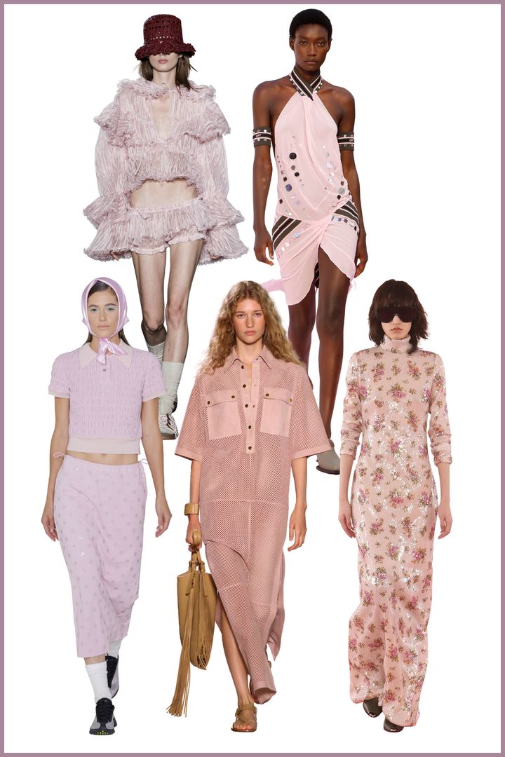 前回の秋冬に台頭したスモーキーピンクと同じく、今季は甘さを抑えたくすみ系のダスティローズが主役に浮上。「アクネヴァス」ではフリルやシャーリングを用いたセンシュアルなルックに、 「ブランドン マクスウェル」では繊細なフローラルモチーフをちりばめたドレス、 そして「マイケル・コース」ではリラックス感のあるロングシャツドレスに取り入れられ、軽やかでナチュラルなムードを演出した。さらに「オフ-ホワイト」や「プライベート ポリシー」ではカジュアルやスポーティーなスタイルにも登場し、甘さとモード感を両立するカラーとして存在感を示している。