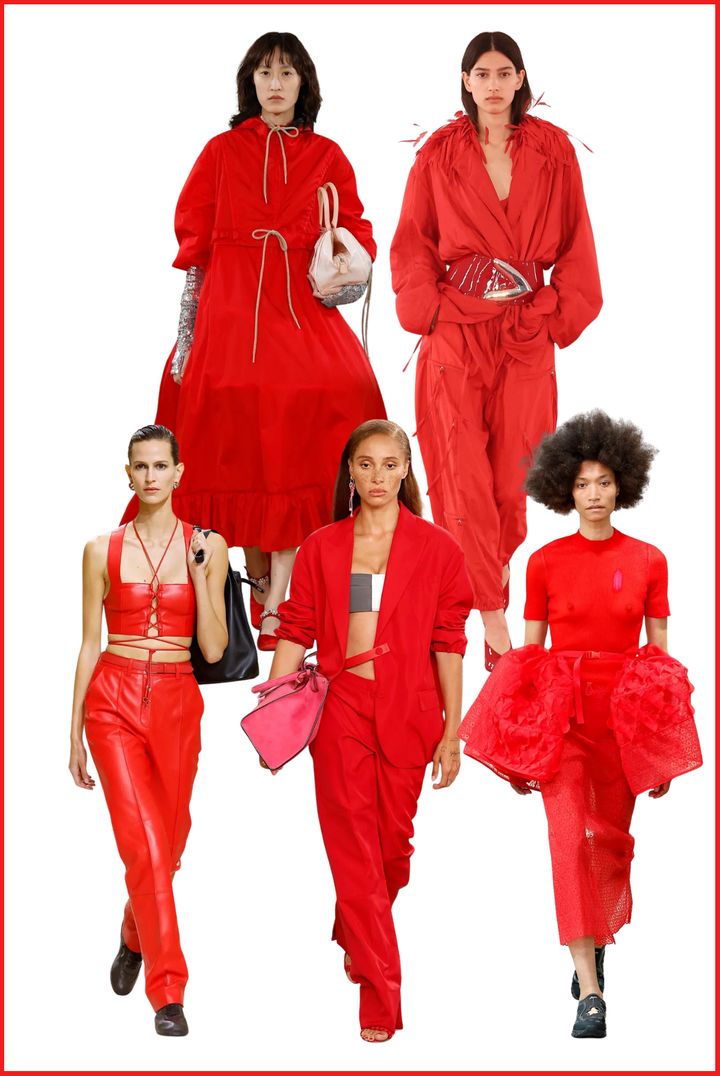 ドラマチックに力強く映えるフレイムレッドが、2026年春夏のキーカラーに浮上。明るくクリアなトーンながら、どこか深みを感じさせる赤は、情熱的でありながらも凛(りん)としたムードに。「フェンディ」や「エルメス」ではレザー素材やセットアップで取り入れられ、強さの中に上質さを宿すルックに。「セシリー バンセン」では立体的なフリルや軽やかなテクスチャーを通して、赤の持つフェミニニティを再解釈。意志を感じさせる鮮烈なトーンが、今季のムードにもベストマッチ。