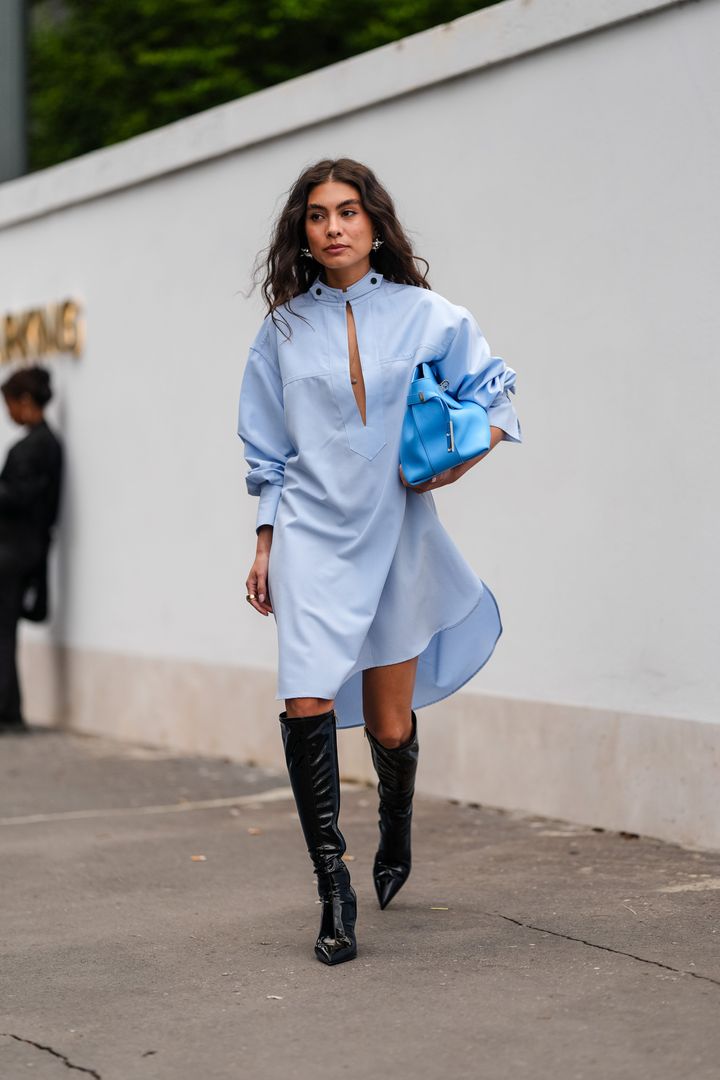 クリーンな印象が強いアイスブルーは、甘さを抑えてシャープに振るのがおすすめ。シャツワンピやテーラードなど構築的なシルエットを選び、そこにブラックのロングブーツやレザー小物を合わせれば、クールなモード感が加わって一気に都会的なムードに。