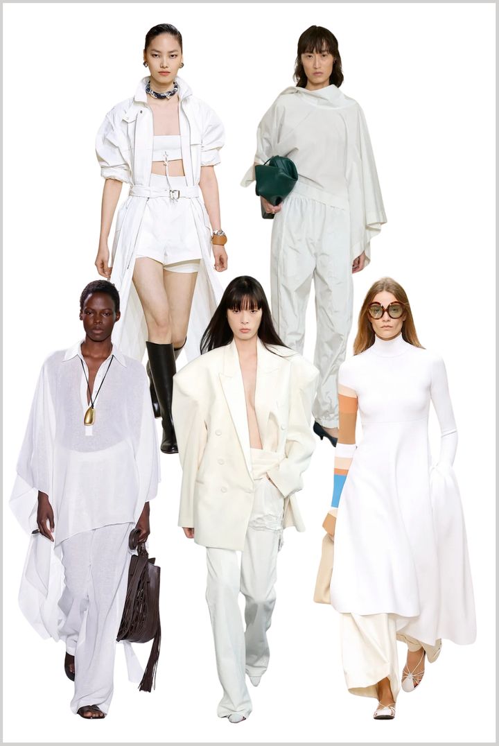 無駄をそぎ落としたようなピュアホワイトが、今季のランウェイを象徴するカラーに。「エリア」では直線的なショルダーラインが印象的なスーツで力強く、「エルメス」ではクロップドトップとロングコートのレイヤリングで軽快に、「マイケル・コース」ではリネンのようなナチュラルな素材を用い、リラックスしたムードを漂わせた。研ぎ澄まされたホワイトが、4都市を通して今季のミニマリズムを際立たせた。