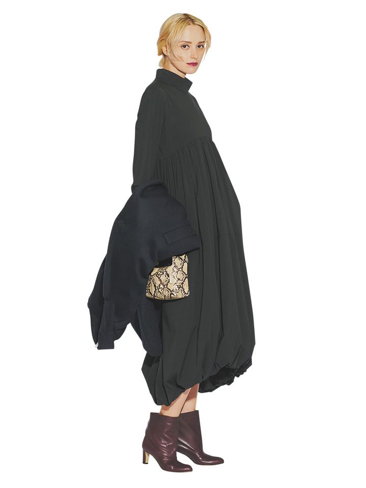 メリハリがつくのに肉感は拾いにくい、下半身に少しゆとりを持たせた地厚な生地の構築フォルム。手元を隠すほどの長いそでが、細身の緊張感をゆるめる抜けをもたらしてくれる。