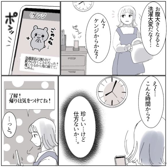 カナは現在妊娠8カ月。夫のケンジもお腹の子に会えるのを楽しみにしており、夫婦で幸せな毎日を過ごしていた。しかし、突然ケンジから帰りが遅くなると連絡が入る。