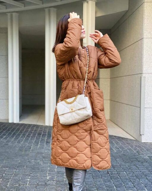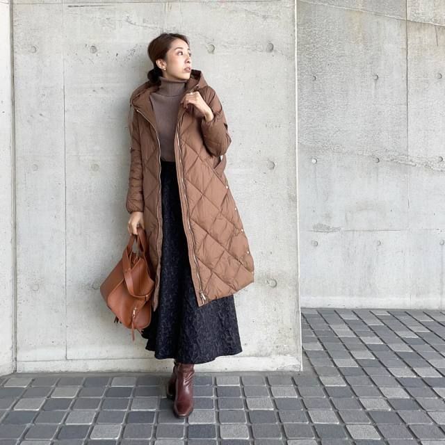 50代のコーデに馴染みやすいのが「明るめブラウンのダウンコート」。コツは渋みのあるダークブラウンではなく、モカやキャメルなど明度が高いブラウン系を選ぶこと。明るい色で取り入れることで重厚感のあるダウンコートが沈まず女性らしい雰囲気に。しかも羽織るだけで落ち着いたスタイリングに決まる一着です。