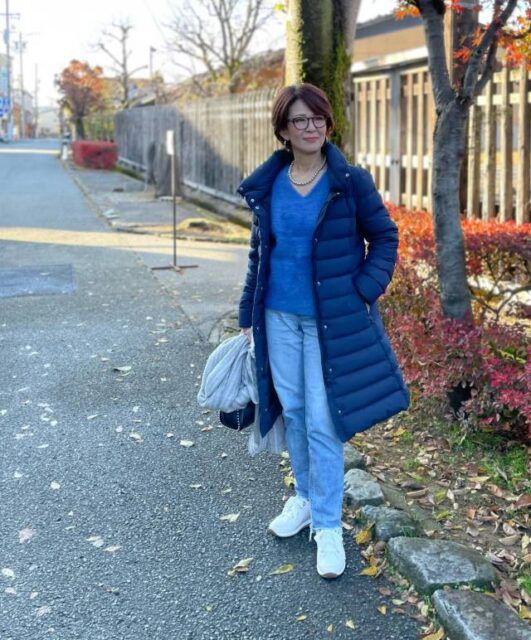 大人っぽさと清潔感を両立するのが「ネイビーのダウンコート」。ダークな色ですが、黒ほど重たくはならずコーデに知的な印象を醸し出します。またデニムパンツと相性よく決まるので、50代のカジュアル派さんにぴったりです。