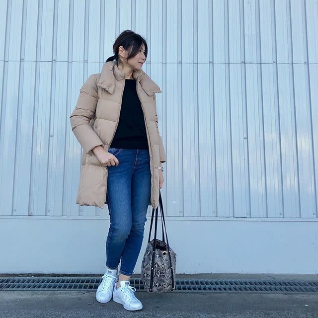 中でも顔映りがいいのは「白のダウンコート」。真っ白が気恥ずかしいようなら、黄味がかった「オフホワイト」を選ぶと取り入れやすくなりますよ。
