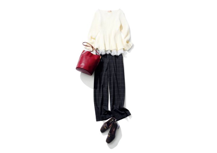 パンツ¥9,990/ANYSIS(オンワード樫山) レースキャミソール付きチュニック¥23,100/アプワイザー・リッシェ ショルダーバッグ¥6,490/カシュカシュ(アンビリオン) コインローファー¥18,150/ダイアナ(ダイアナ 銀座本店)