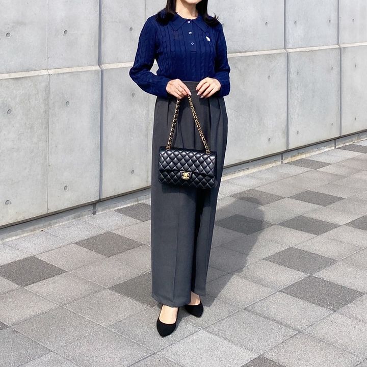 ボトムスにはグレーのワイドパンツを合わせ、シックな配色で統一。パンツの落ち感がきれいなので、ニットのボリューム感とのバランスが絶妙です。キャプションにもあるように、ポロ襟が顔周りをきれいに見せてくれるのもうれしいポイント。黒のキルティングバッグやパンプスを合わせることで、さらにクラス感もアップ。