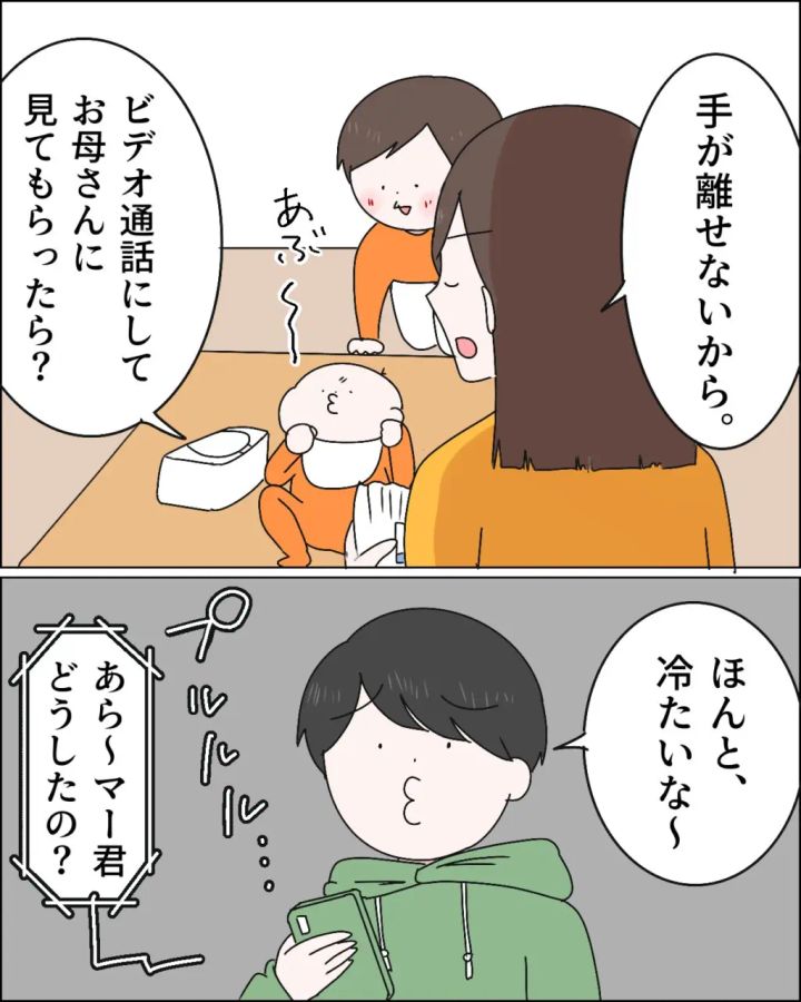オムツ替えしていた私が「手が離せないから。ビデオ通話にしてお義母さんに見てもらったら?」つっけんどんにそう言うと、「ほんと、冷たいな~」と言いながら即電話。もちろん相手は義母です。「あら~、マー君どうしたの?」義母がそう言うと、