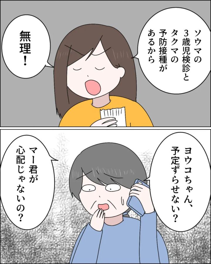 「ソウマの3歳児健診とタクマの予防接種があるから無理!」と即答する私。すると、「ヨウコちゃん、予定ずらせない?マー君が心配じゃないの?」と義母が言い出しました。
