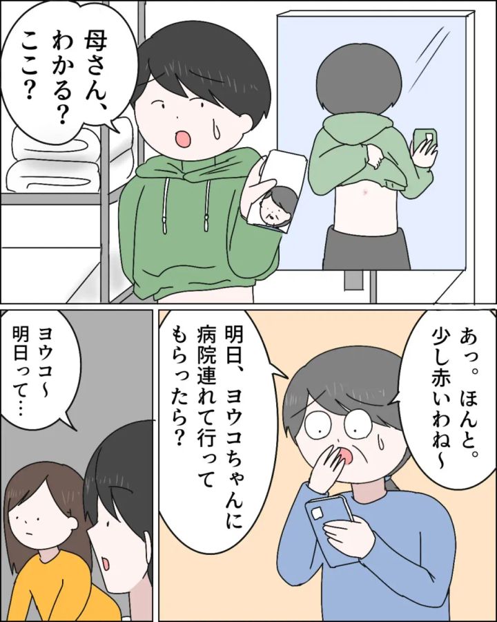 「母さん、わかる?ここ?」とスマホ越しに鏡に映した背中を見せるマサオに、「あっ。ほんと。少し赤いわね~。明日、ヨウコちゃんに病院連れて行ってもらったら?」と言う義母。「ヨウコ~、明日って・・」と言い出すマサオにすかさず、