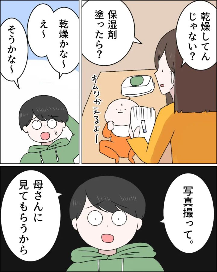 「乾燥してんじゃない?保湿剤塗ったら?」そう言いながらタクマのオムツを替えようとすると、「乾燥かな~、え~、そうかな~」と言ってるだけで何もしようとしないマサオは、「写真撮って。母さんに見てもらうから」と言い出しました。