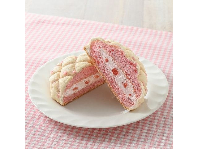 いちご風味チョコチップを練り込んだ白いビスケット生地をかぶせたメロンパンに、いちご果肉入りミルクホイップをサンドしました。