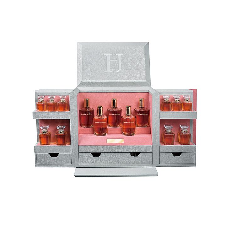 香水のビスポークはブティックでのコンサルテーションからスタート。香りのコンセプトが決まってから数カ月後、南仏のラボで作られた香りのサンプルが3種届き、自分だけの香りを決定。香水を納めるチェストなども決めていきます。その香りはメゾンの歴史の一部としてライブラリーに保存され、メゾンのメンバーとして最高のケアを受けられます。写真は納品の一例、価格は¥15,400,000[税別]~。(アンリ・ジャック銀座)