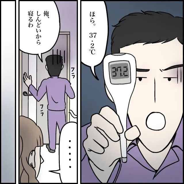 タカシは脇から体温計を外すと、青ざめた顔で「ほら、37.2℃」と言いました。そして「俺、しんどいから寝るわ」とフラフラした足取りで寝室へ向かっていきます。私は「微熱だよね? 本当にそんなにつらいの?」と喉まで出かかった言葉を飲み込み、黙ってその背中を見送りました。