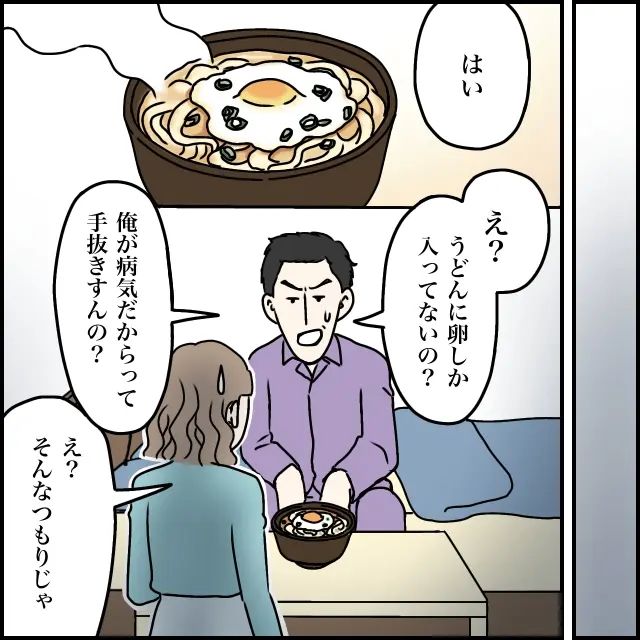 私は寝室で休んでいるタカシのもとへ、温かいうどんを持っていきました。するとタカシは苦笑いを浮かべながら「え?うどんに卵しか入っていないの?俺が病気だからって手抜きすんの?」と一言。軽めのものなら何でもいいと言っていたはずなのに・・・だったら、最初からちゃんと希望を言ってほしいものです。
