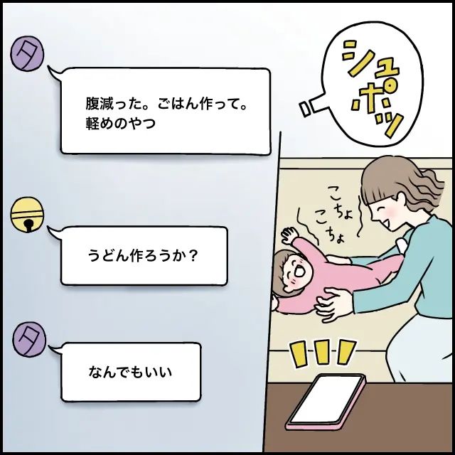 家事をひと通り済ませてモモと遊んでいると、突然タカシから「腹減ったからごはん作って、軽めのやつ」とメッセージが届きました。微熱とはいえつらそうだったので、身体に負担の少ないものがいいだろうと思い、「うどん作ろうか?」と尋ねました。すると「なんでもいい」と返信が。