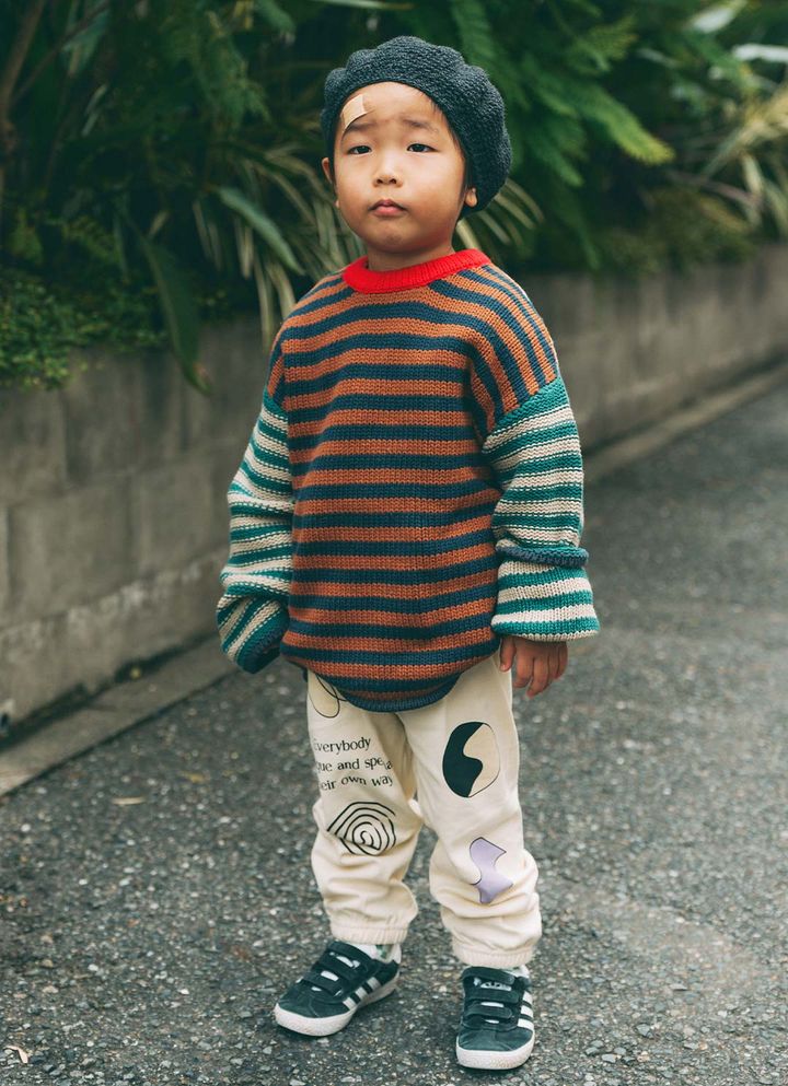NAME:かなうくん・3歳難易度高めのストライプパンツをさらりと着こなすかなうくん。深みのあるバーガンディのブルゾンに、グリーンとピンクのバイカラーが目を引く『オールドジョー』のカギ編みハットをちょこんと合わせて、ちょっぴりレトロでムードのある佇まいに。思わず振り返ってしまうほどクールな存在感。item▼