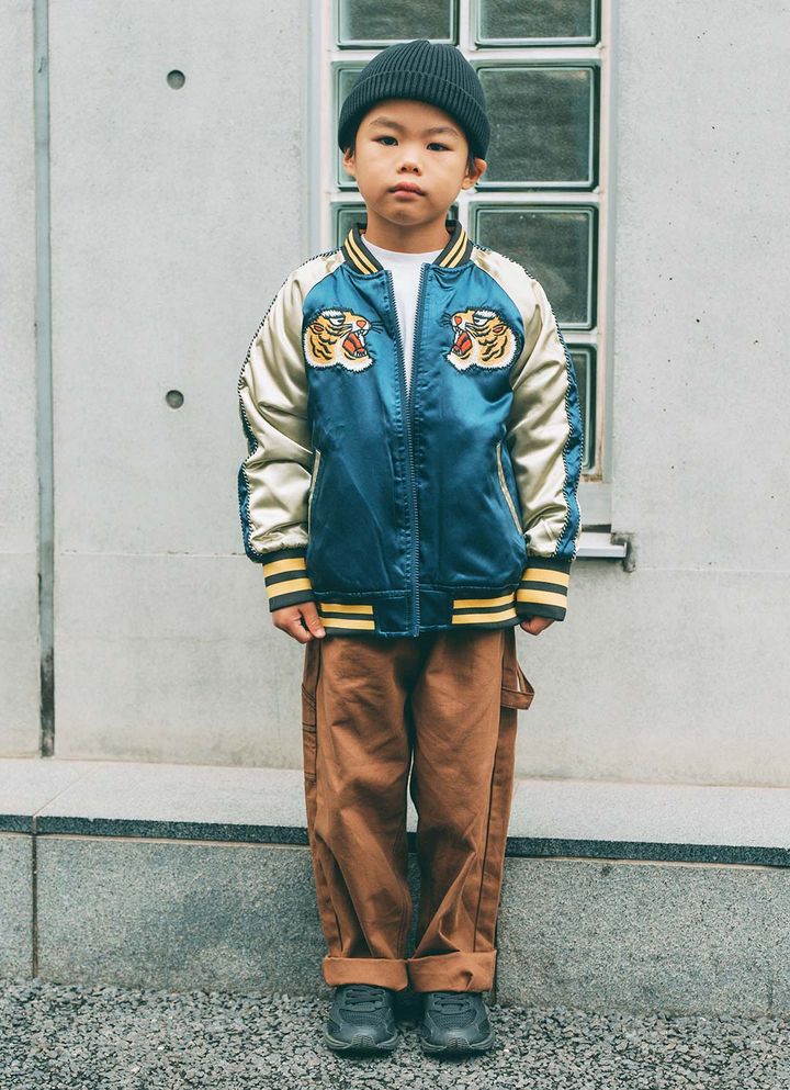 NAME:しきくん・7歳光沢のあるサテン素材に、トラの刺しゅうが映える『マーキーズ』のスカジャンを主役に、アメカジスタイルを堪能中のしきくん。ボトムはトレンド感もあるブラウンのカーゴパンツを合わせて、ほどよく今っぽさをプラス。仕上げに黒のビーニーをオンして全体をきれよく引き締めた大人っぽい着こなしに。item▼