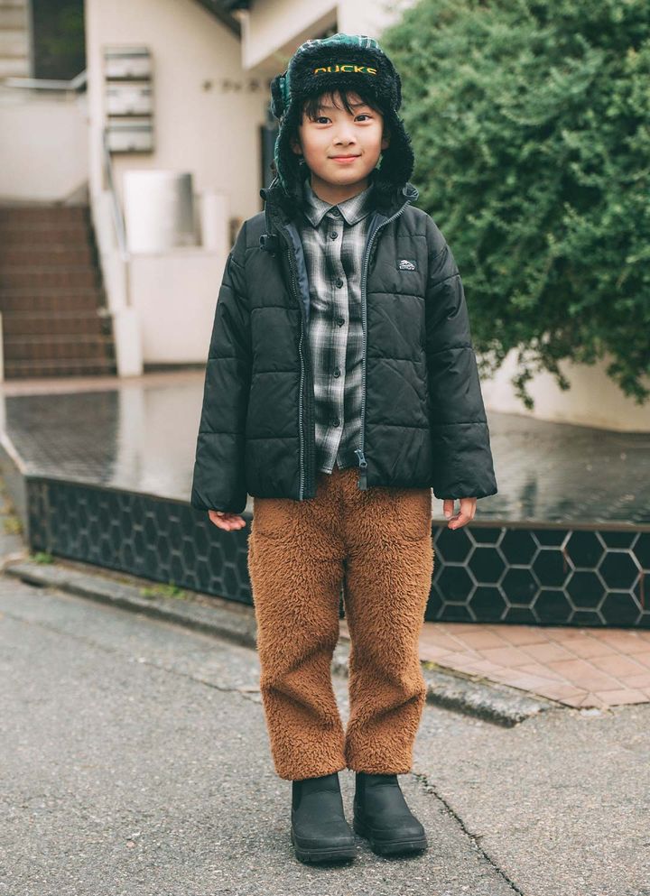 NAME:せいたろうくん・7歳ふんわりあったかな『マーキーズ』のボアフリースパンツに、『ベイフロー』の中綿ジャケットをオン。ブラックをベースにまとめつつ、ブラウンパンツを差し色にしたマチュアな雰囲気がカッコイイせいたろうくん。異素材ミックスや、ボリュームのあるフライトキャップを効かせた上級者スタイル。item▼