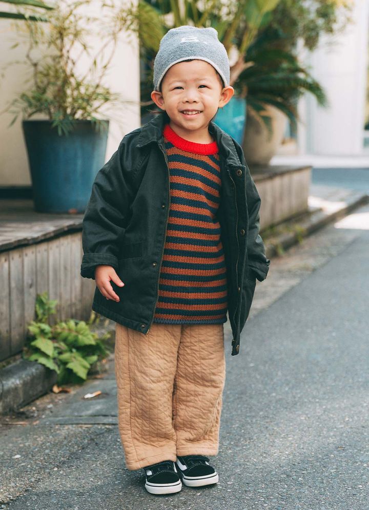 NAME:みちくん・3歳ざっくりニットに厚手のキルティングボトムを合わせて、冬素材をバランスよく取り入れたみちくん。黒のアウターで全体を引き締めることで、ラフになりすぎないストリート感をキープ。シンプルながらも素材感にこだわった、さらっとサマになる着こなしが魅力。おしゃれも防寒も叶えてくれるニット帽も忘れずに!item▼