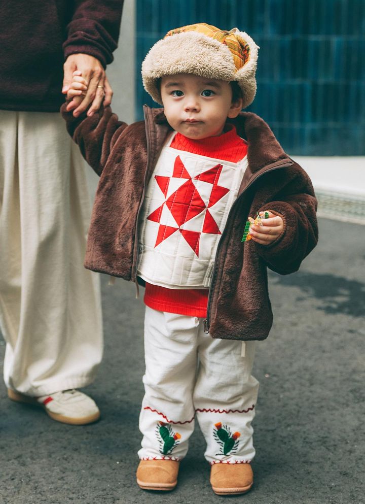 NAME:のあくん・1歳防寒対策抜群のボアアウターに、存在感のある赤のニットと温かみのあるハンドメイドのベストをレイヤード。ボトムはサボテン刺しゅうのホワイトパンツを合わせて、ちょっぴり陽気なエッセンスを注入。チェック柄×ボアのフライトキャップが、センスのいいのあくんの着こなしを引き立てて、コーデを格上げ。item▼