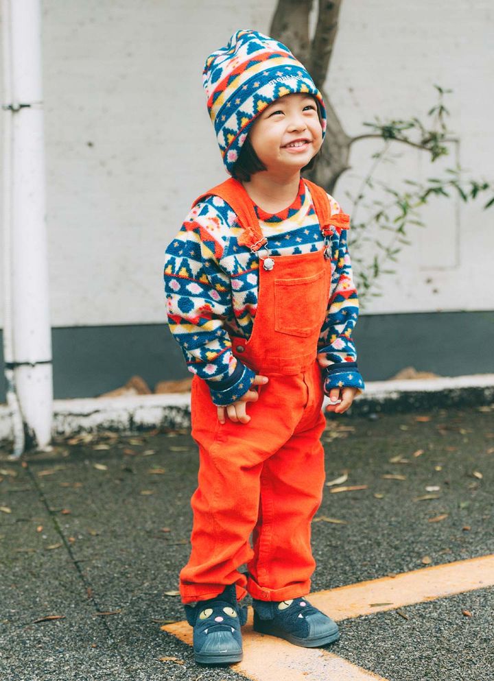 NAME:こはくくん・2歳まるで絵本の中から飛び出してきたような、元気いっぱいな着こなしが魅力のこはくくん。鮮やかなオレンジのオーバーオールに、ノルディック柄のトップスとハットを合わせて、シーズンムードをぐんとアップ! 足元は、「シンプソンズ一家」の飼い猫、スノーボールをイメージした『アディダス』とのコラボスニーカーで遊び心たっぷりに仕上げて!item▼