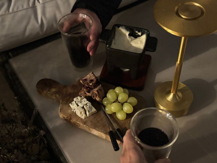 小さなカッティングボードに冷蔵庫に眠っていたブルーチーズとフルーツ、パンを添えれば出来上がり。とろとろのチーズフォンデュと一緒にいただきます。これがまたホットワインに合う~♡