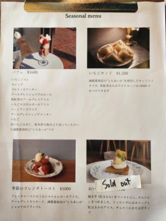 そしてこちらがイートインメニューの一部です。以下は訪問時(12月)のものですが、イチゴ(栃木県の「とちあいか」を使用)メニューは3月まで予定されているそうで、12月は紅茶をテーマに、1月は和スイーツになるようです。