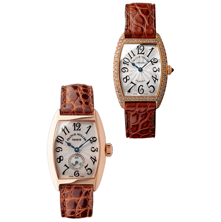 左からトノウ カーベックス[手巻き W25×H35㎜ K18PG]¥2,310,000、トノウ カーベックス ダイヤモンド [クォーツ W25×H35㎜ K18PG×DIA]¥3,740,000(共にフランク ミュラー/フランク ミュラー ウォッチランド東京)
