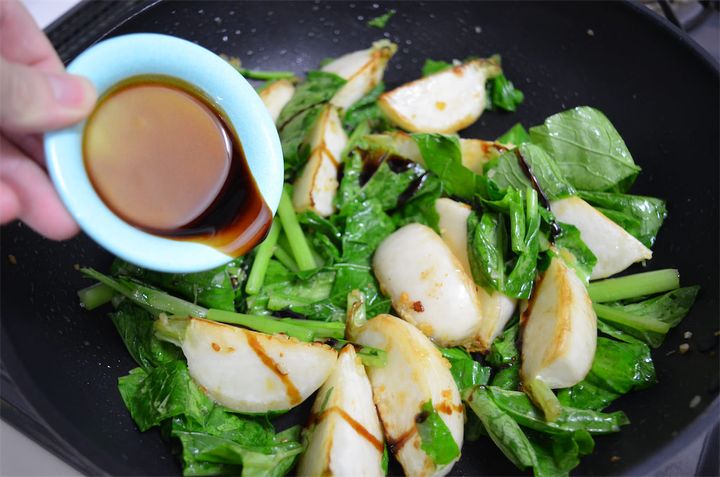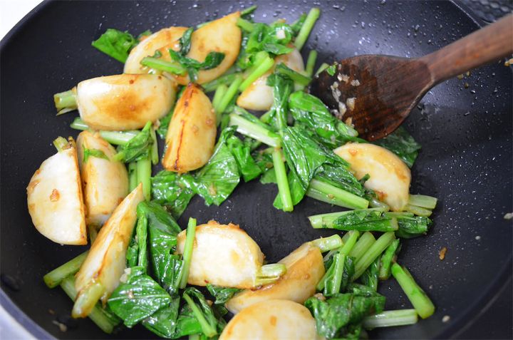 2. かぶに焼き色が付いてきたら葉の部分も入れて炒め、オイスターソースを入れる。