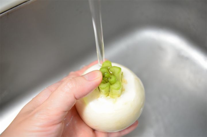 かぶは、根元に近い茎の部分に土などの汚れがたまりやすいので、葉を切ったあと、爪楊枝などを使って汚れを取り除いてください。