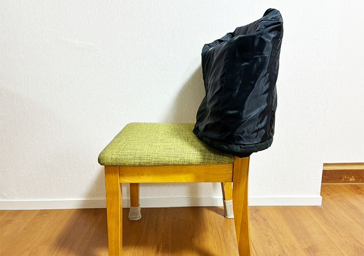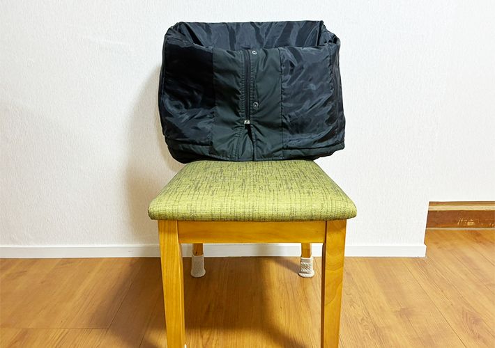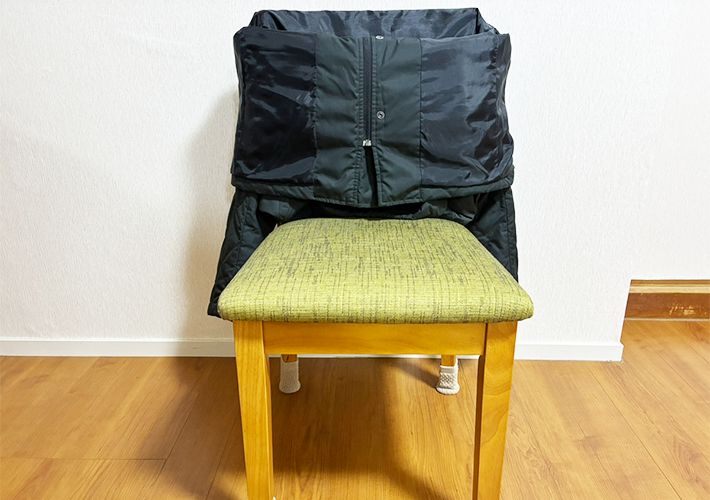 手順1:チャックを閉めて、椅子の背もたれにかける