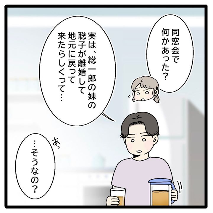 沈んだ様子の正志が心配になり「同窓会で何かあった?」と聞いてみると、視線を落としたまま「実は、総一郎の妹の聡子が離婚して地元に戻ってきたらしくって・・」と話してくれたので「あっ・・そうなの?」と返した私。正志の同級生の総一郎さんに妹さんがいることは何となく聞いたことがありました。
