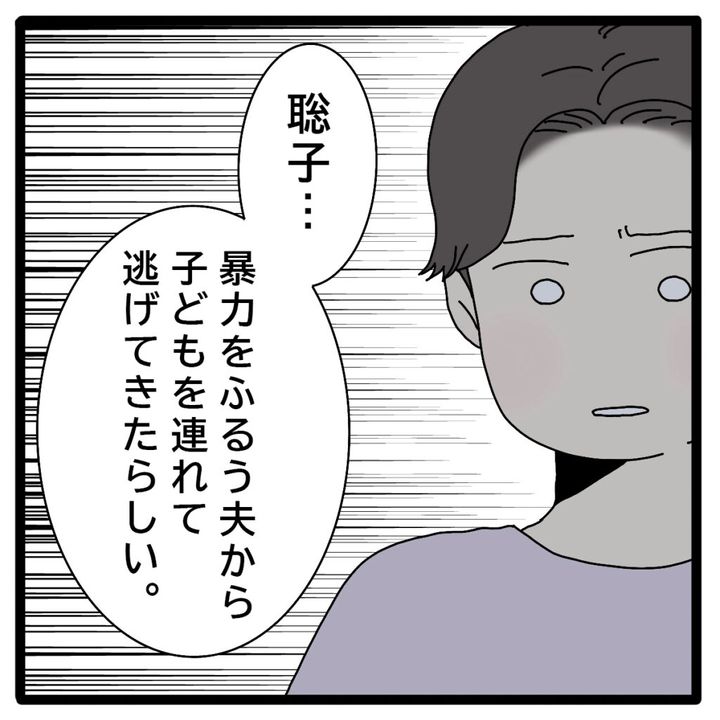 そして、正志は心配そうに「聡子・・暴力をふるう夫から子どもを連れて逃げてきたらしい」と続けました。