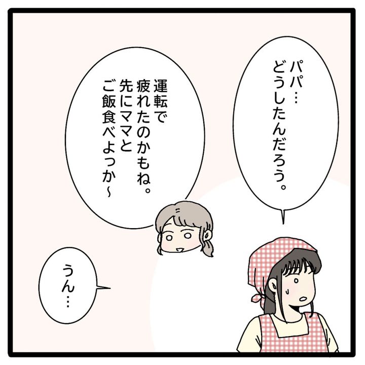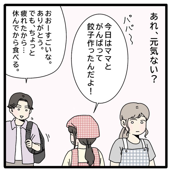 あれ?元気ない?私は正志の様子に違和感を覚えました。「パパ~。今日はママとがんばって餃子作ったんだよ!」とリマが伝えると、「おぉーすごいな。ありがとう。でも、ちょっと疲れたから・・休んでから食べる」と笑顔を見せたものの疲れた様子の正志。