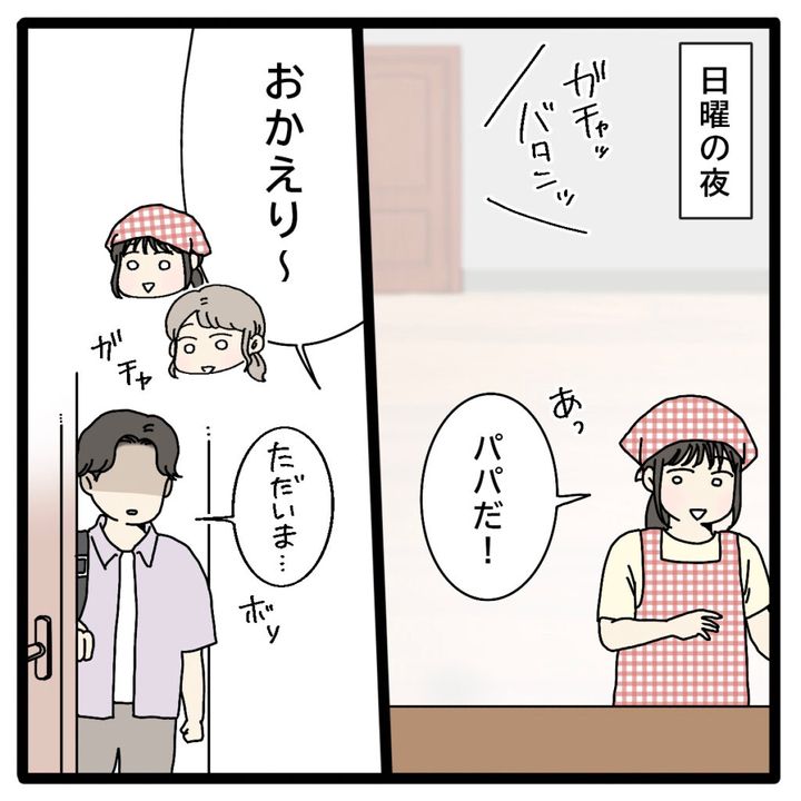 日曜日の夜。玄関が開く音がして「あっ、パパだ!」とリマが嬉しそうに言いました。「おかえり~」と2人で出迎えたのですが、正志は俯いたままボソッと「ただいま・・」と呟くように言って部屋に入って来ました。