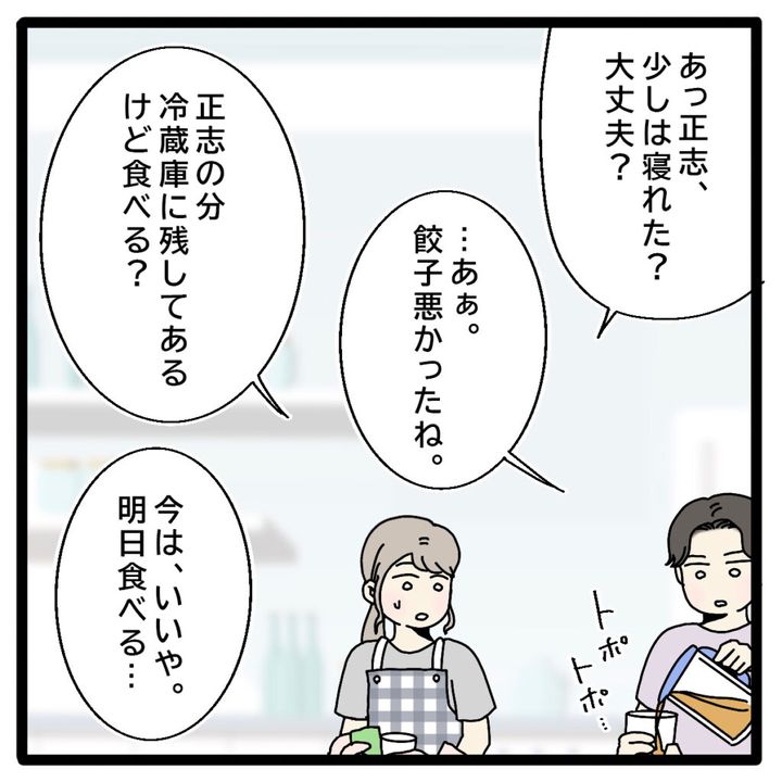 しばらくして、寝室から正志が戻って来ました。「あっ正志、少しは寝れた?大丈夫?」と声をかけると「・・あぁ。餃子悪かったね」と申し訳なさそうな正志。「正志の分、冷蔵庫に残してあるけど食べる?」と聞きましたが、「今はいいや。明日食べる・・」とやはり元気がありません。