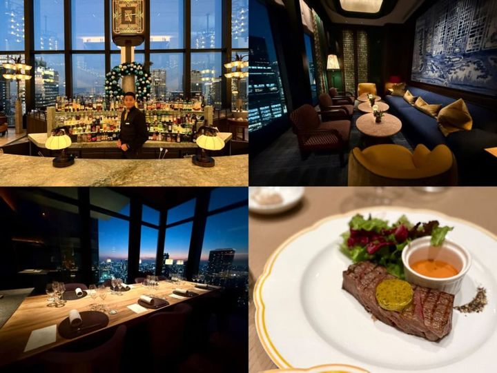 右上から時計回りに:ピーコックアレーに隣接する隠れ場のようなバー「ケーンズ&テイルズ」、「ジョリー ブラッセリ―」で人気の和牛ステーキ。鉄板焼きとお寿司が楽しめる日本料理「月見」、古き良き時代のニューヨークの雰囲気を感じる「ピーコック・アレー」。