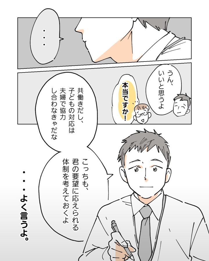 「僕たち夫婦は共働きで、妻も仕事を大事に思っていて、一生懸命働いています。だから・・僕もそれを応援したいんです」と真っ直ぐな目で伝えてきた部下。