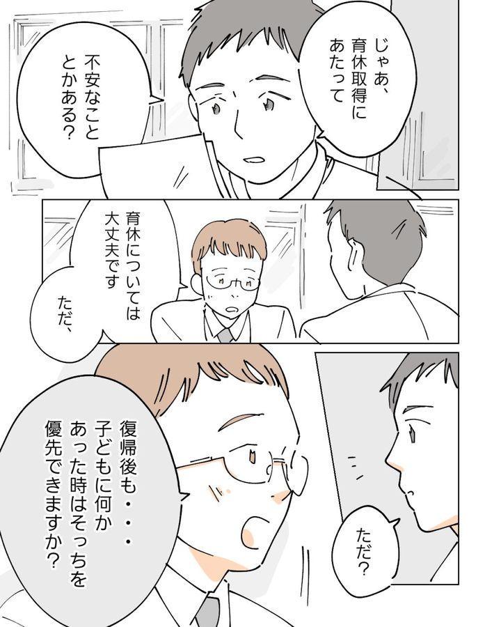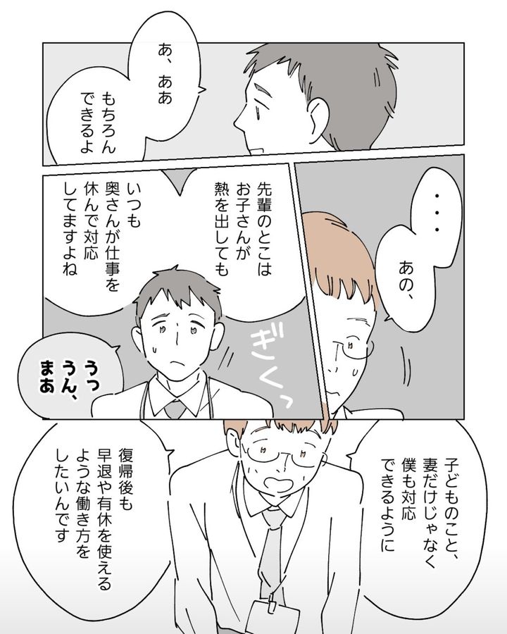 「もちろんできるよ」と答えると、「・・あの、先輩のとこはお子さんが熱を出してもいつも奥さんが仕事を休んで対応してますよね」と言いにくそうに言いました。いつもちひろに任せていることを後ろめたく思っていた俺は、痛いところを突かれて気まずさを覚えながら「うっ、うん、まぁ」と言うと、部下は「子どものこと、妻だけじゃなく僕も対応できるように復帰後も早退や有休を使えるような働き方をしたいんです」と言いました。