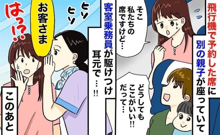 「私たちの席ですが…」飛行機の予約席に別の親子。理不尽な要求をし居座り続け…すると客室乗務員が耳元で