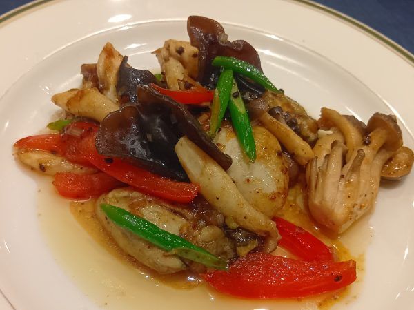 ★メイン料理「牡蠣の黒豆炒め」 ふわふわ柔らかで大ぶりな牡蠣がたくさん。そして黒キクラゲやシメジとともに豆鼓で炒めた味わいは、甘くてコク深くとろける極上の美味しさ!