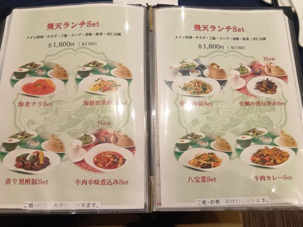 週末メニュー「飛天ランチSet」は8種類あり、とってもおすすめ♪ なぜなら、メイン料理・サラダ・ご飯・スープ・香物・飲茶(2種)・杏仁豆腐に、たっぷりジャスミン茶まで付いた豪華8品セットなんです。さらに! ご飯か中華お粥を選べ、おかわりもOK。 なんて贅沢なのでしょう〜。あれもこれも楽しみたい興奮を抑えられないほど魅力的午餐。